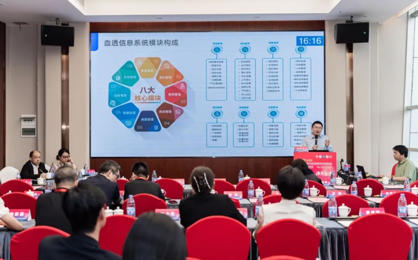 貴州醫(yī)科大學附屬醫(yī)院嚴瑞教授在《自動化血液透析設備的發(fā)展及應用》課題中,以山外山血液透析機為例,介紹了智慧血透設備人性化操作、智能可視系統(tǒng)、精準治療過程控制等亮點,引起與會專家關注。
